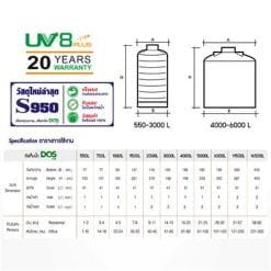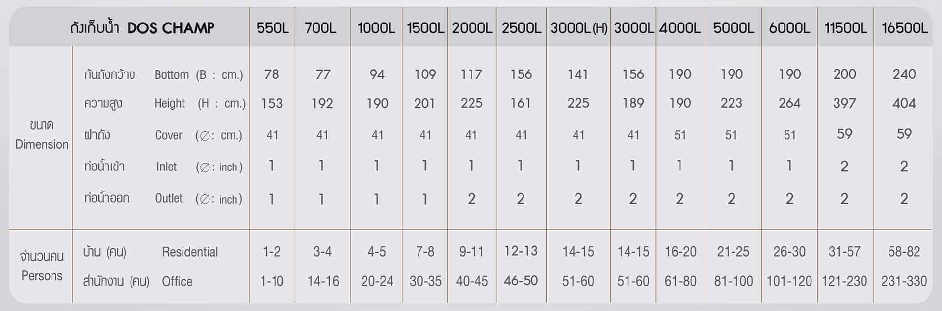 - ถังเก็บน้ำบนดินพร้อมลูกลอย DOS รุ่น CHAMP ขนาดความจุ 3,000 ลิตร ใช้สำหรับสำรองน้ำไว้ใช้ภายในบ้านและสำนักงาน