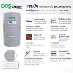 ถังเก็บน้ำพร้อมลูกลอยคุณภาพดี DOS รุ่น CHAMP สำหรับใช้สำรองน้ำไว้ใช้อุปโภค-บริโภค ภายในบ้านหรือสำนักงาน แข็งแรง ทนทาน ไร้สารพิษ ป้องกันแสงแดด ไร้กลิ่น และปลอดภัย ด้วยวัสดุ Polymer Elixer และ วัสดุ Food Grade 100% ผ่านการรับรองมาตรฐาน ระดับสากล FDA สีไม่หลุดลอกปนลงในน้ำ ปราศจากสารตะกั่ว และปรอท ไร้สารโลหะหนัก ไร้กลิ่นอันไม่พึงประสงค์ มาตรฐานเดียวกันกับท่อน้ำดื่ม ถังเก็บน้ำ DOS ป้องกันการลอดผ่านของแสงแดดได้ 100% จึงมีความทึบแสง ปลอดภัยสูงสุด ทำให้ไม่เกิดตะไคร่น้ำ ถังเก็บน้ำ DOS จึงสะอาด ปลอดภัยต่อผู้บริโภค