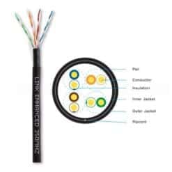 • สายสํญญาณตามมาตรฐาน ANSI/TIA-568-C.2 CAT5E 350 MHz สำหรับติดตั้งในระบบคอมพิวเตอร์ภายนอกอาคาร เปลือกนอกสองชั้นทนแดด ทนฝน ไม่กรอบ